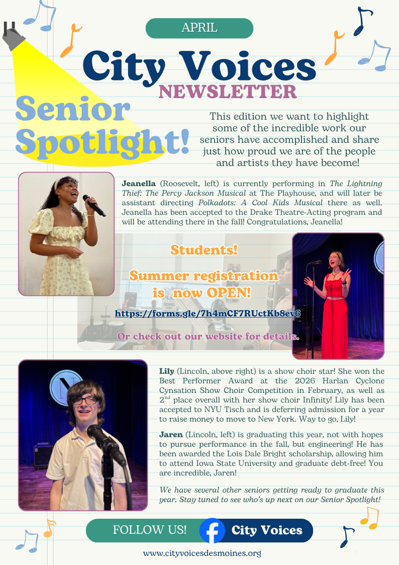 Our Senior Recital will be held Sunday, May 3 at 6:30 p.m. at Noce Jazz Club (1326 Walnut St., Des Moines). Featuring seniors from Roosevelt, Lincoln, Hoover, and Urbandale singing programs they have chosen! Don’t miss it! Free admission!