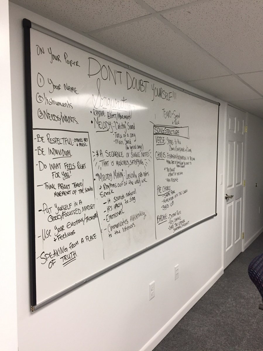 Songwriting white board Published January 14, 2018 at 2448 × 3264 in Media ← Previous Next → The 2017 Summer Music Academy featured many Enrichment classes, including Songwriting, led by local musician Courtney Krause. Like Loading...